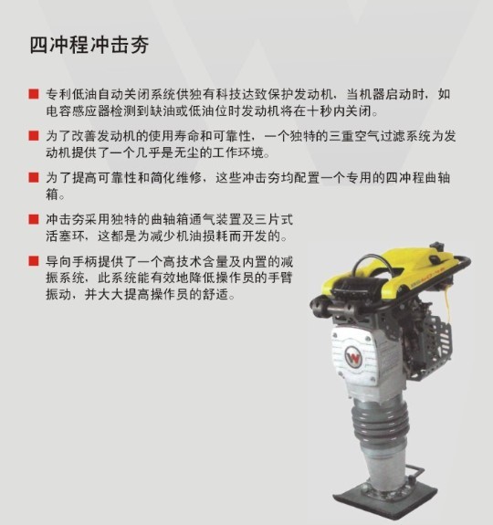 *沖擊夯采用獨(dú)特的曲軸箱通氣裝置及三片式活塞環(huán),這都是為減少機(jī)油損耗而開發(fā)的。
